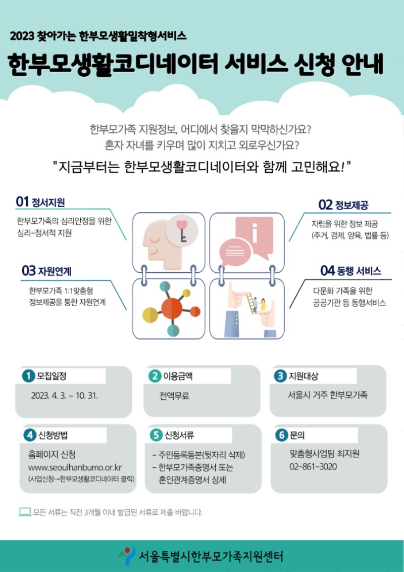 - 신청방법: 홈페이지- 사업신청- 한부모생활코디네이터- 신청일정: 2023. 4. 3. ~ 2023. 10. 31. (상시모집)