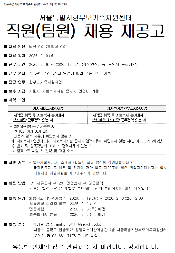 서울특별시한부모가족지원센터 직원 채용 재공고
