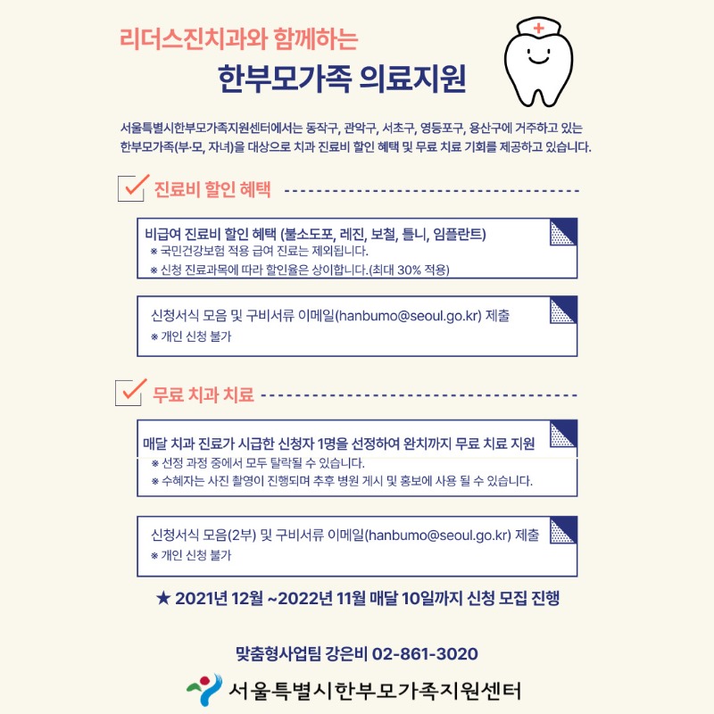 이에 한부모가족을 위해 치과 진료비 할인 또는 무료치료를 지원하고자 합니다.