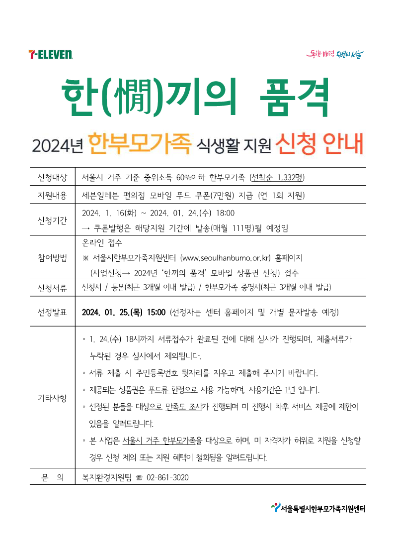 문의사항은 센터 한부모응답소 또는 02-861-3020 으로 연락주세요.
