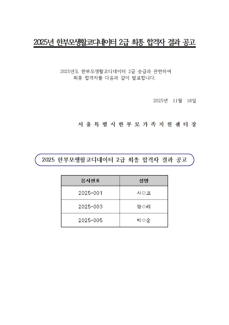 2025년도 한부모생활코디네이터 2급 승급 면접시험에 참여해주신 응시자 분들께 감사드리며,