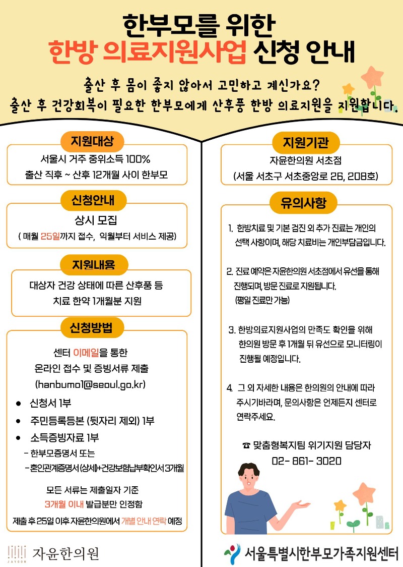 우리센터에서는 출산 후 건강회복이 필요한 한부모에게 산후풍치료한약을 지원합니다.